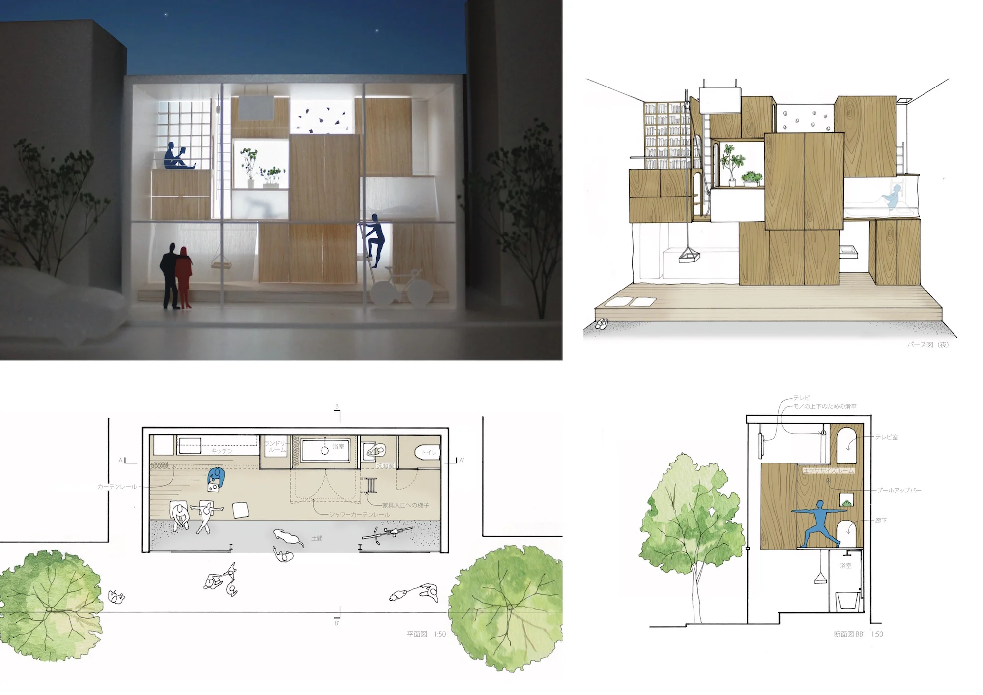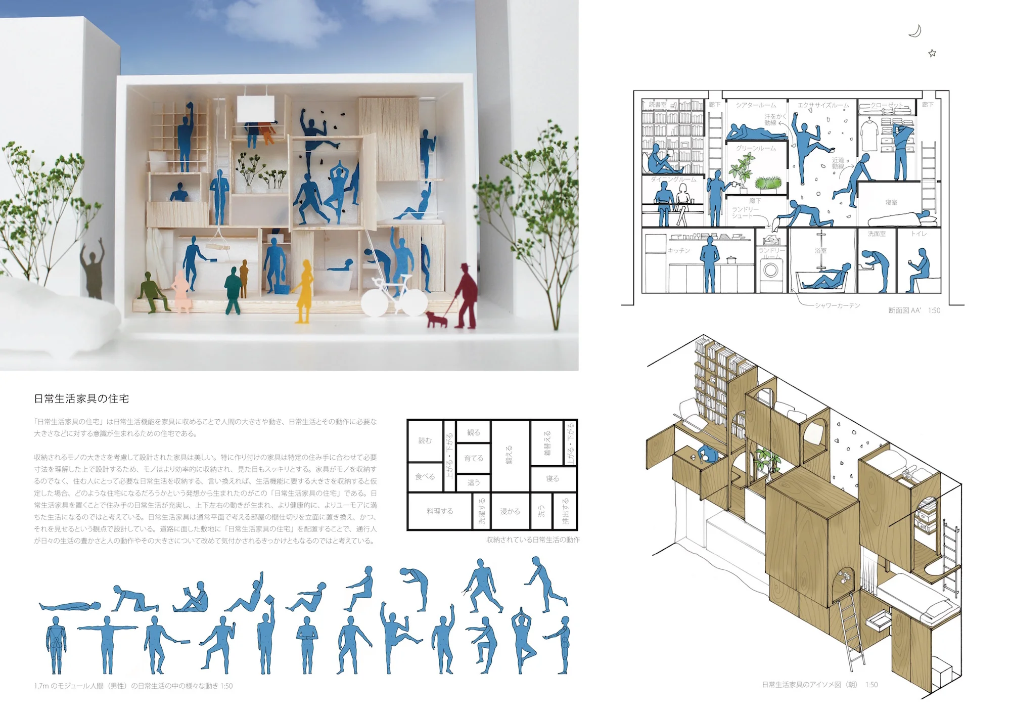 弊社は日常生活を縦に表現し家具の中に収め、その生活を見せるということで、人の大きさや動き、日常生活とその動作に必要な大きさに対しての新たな認識が生まれるのではないかと思い、この「日常生活家具の住宅」を提出した。しかし、今回のコンペで求められていた「大きさ」の概念を更新しているわけではないと、結果発表を見て改めて反省。また、表現の仕方についても既視感を感じさせるような絵では全く古いものにしか見えない、とこれまた反省。でも、楽しくコンペができたのでこれはこれで良しとする。